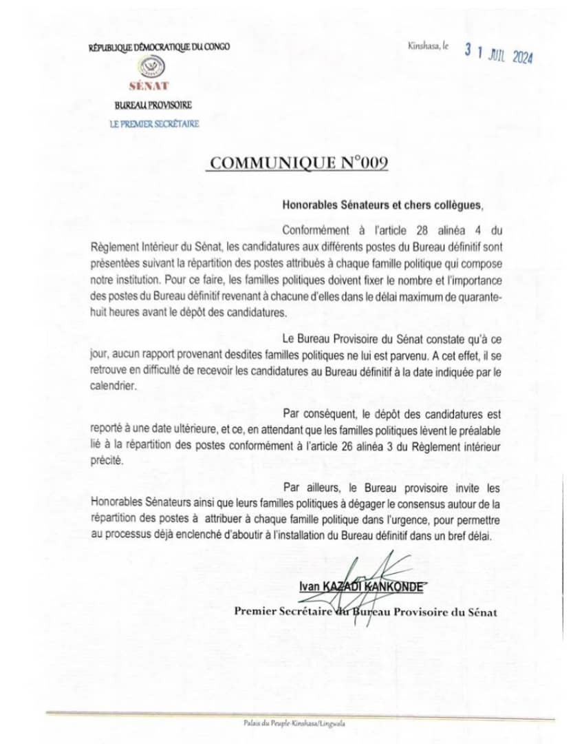 RDC/Sénat : nouveau report sine die du dépôt des candidatures aux postes du bureau définitif By Admin Politique Read More